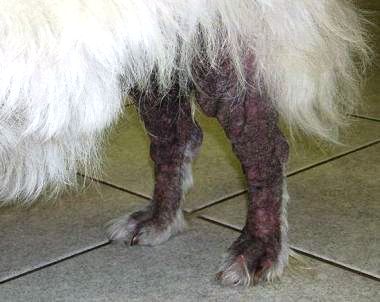 Milben. Typisch für die Sarcoptesräude ist hochgradiger Juckreiz – er ist mit kaum einer anderen Hauterkrankung zu vergleichen. Er bleibt ganzjährig unverändert stark und zeigt ein typisches Verteilungsmuster: Zuerst und am stärksten sind Ohrmuscheln, Gliedmaßen (z.B. Ellenbogen und Sprunggelenke) und Bauch betroffen, dann der Kopf und zuletzt der Rückenbereich. Sehr schnell folgen bakterielle Entzündungen, Krusten, Haarverlust und schließlich oft enorme chronische Veränderungen mit Verdickung und Schwarzfärbung der Haut („Elefantenhaut“). Zusätzlich treten Gewichtsverlust, Ruhelosigkeit und mitunter Wesensveränderungen (Aggressivität!) auf. Besonders auffällig ist eine Verstärkung des Juckreizes nachts und in warmer Umgebung – im Gegensatz zu Allergien etwa, bei denen Juckreiz in der Nacht eher ungewöhnlich ist. Die betroffenen Hunde sind „unkonzentriert“ oder „ungehorsam“ und kratzen sich selbst im Behandlungsraum des Tierarztes (ein Symptom, das nur bei ganz wenigen anderen Erkrankungen beobachtet wird!). Es wird angenommen, dass das klinische Bild weniger durch die Schadwirkung der Milben, sondern auf allergische Reaktionen zurückzuführen ist.